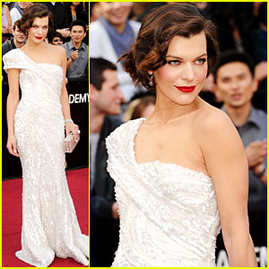 3) Mila Jovovich’s one-shouldered dress with lots of beading and sparkle, with asymmetrical draping: