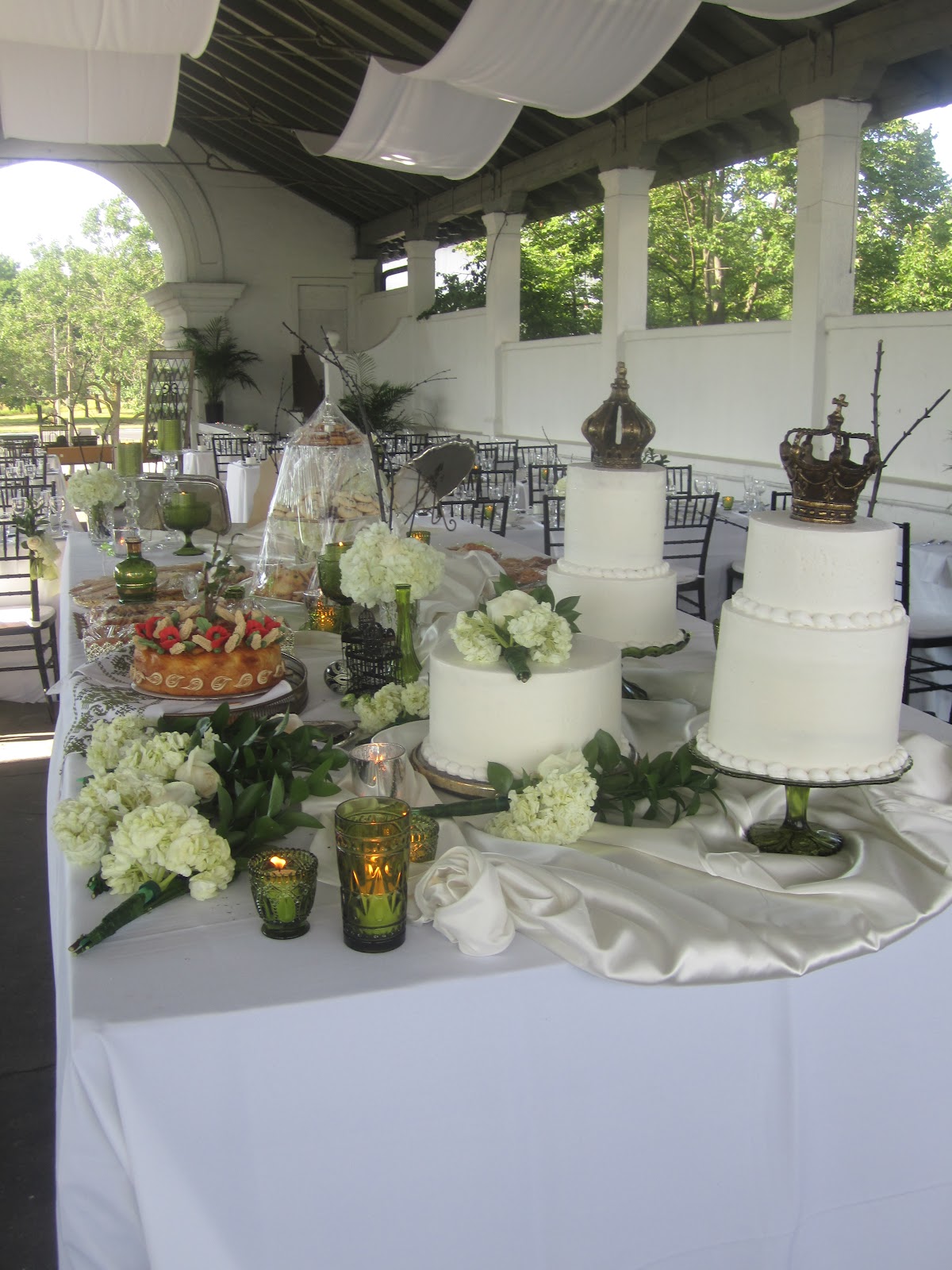 Sanaz had three cakes, pure white accented with crowns and white hydrangeas.